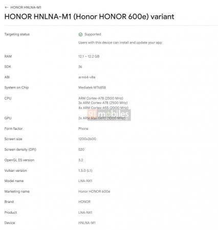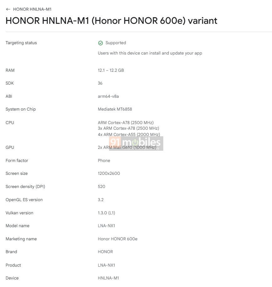 Honor 600e poartă numărul de model XNLNA-NX1, iar în baza de date Google Play apar și câteva detalii cu privire la specificații, dar și o imagine frontală a terminalului. Conform informațiilor, vorbim despre un procesor MediaTek Dimensity 7100, un procesor midrange lansat la începutul acestui an ce include un GPU ARM Mali-G610 MC2 și vine cu suport pentru memorie LPDDR5. Varianta listată în Google Play Console vine cu 12GB RAM, sugerând că telefonul va avea configurații destul de generoase pentru segmentul său.