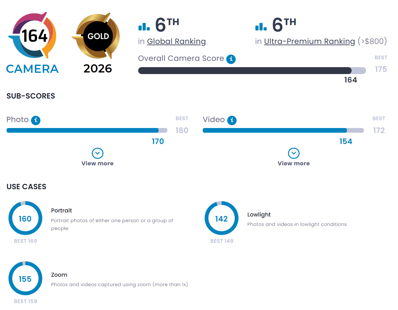 Cele mai mari scoruri le are la Portret, cu 160 din maximul de 169 date până acum şi 142 la Low Light, din maximul de 149. Stă excelent şi la zoom, cu 155 din 159 şi la captura la exterior, cu 176 de puncte din 185.