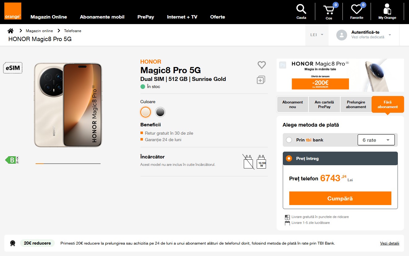 Flagship-ul și camera-phone-ul din lineup este Magic8 Pro, model ce primește aparent 200 euro discount la precomandă dacă aplici în coș codul „200HONOR” la Orange România. Prețul telefonului la liber ar fi de 6743 lei, în timp ce există și oferte la abonament, cu sau fără prelungire contract.