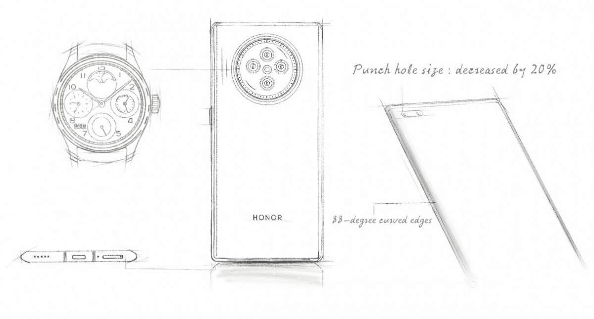 După cum se poate vedea, acest telefon aduce multe în comun cu Mate 40 Pro din punct de vedere al design-ului. Are un ecran curbat lateral la 88 grade, decupaj selfie pilulă pentru camera selfie duală și în spate un modul foto circular. Look-ul acestui setup este diferit față de cel integrat pe telefonul Huawei amintit anterior și schița pe care o puteți vedea mai jos ne dezvăluie că Honor s-a inspirat de la cadranul unui ceas pentru camera lui V40.