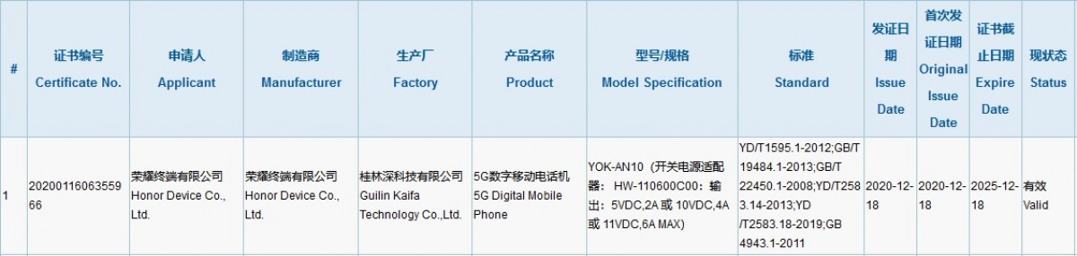 Tot în schiță se mai poate observa și zona inferioară a telefonului (aparent plată), acolo unde apare grila difuzorului, portul USB-C și slotul pentru cartelele SIM. Honor V40 a primit între timp și certificarea 3C (captură mai jos) care scoate la iveală suportul pentru tehnologia de alimentare super rapidă la 66W, fix ca flagship-ul Mate 40.