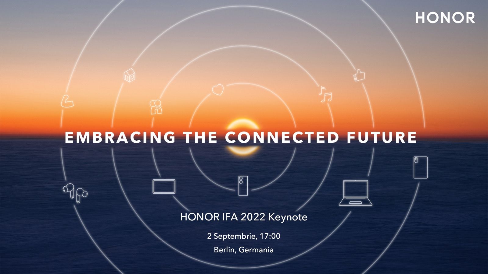Prin intermediul unui comunicat de presă cei de la Honor confirmă participarea la târgului de tehnologie IFA 2022 din Berlin, târg de tehnologie care reunește cele mai populare brandului tech ale momentului. Chiar în ziua deschiderii, pe data de 2 septembrie vom avea un eveniment special susținut de Honor chiar pe scena principală, sub deviza Embracing the Connected Future.