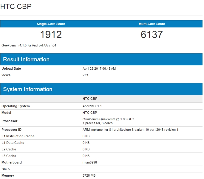 Se știa deja faptul că noul telefon urmează a oferi dotări de top precum procesorul Qualcomm Snapdragon 835, iar astăzi avem o confirmare a prezenței acestui chipset la bord. O listare marca Geekbench ne dezvăluie că într-adevăr SD835 se va afla integrat pe U 11, procesor octa-core tactat la o frecvență de 1.9 GHz și însoțit de un chip de 4 GB memorie RAM care ar trebui să ofere o experiență potrivită în regim de multitasking.