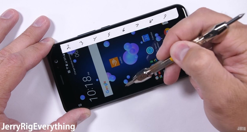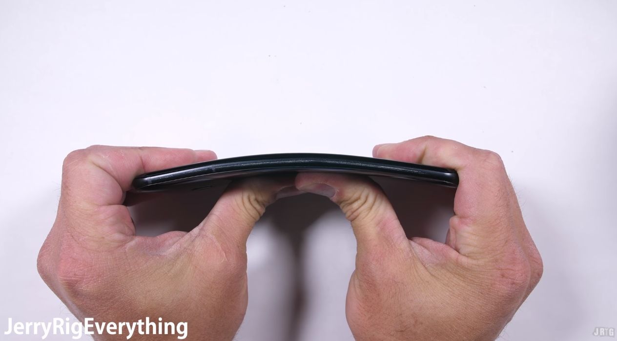 Terminalul a debutat luna trecută, cu sticlă 3D în faţă şi spate şi rama metalică între. Ecranul rezistă la zgârieturi până la nivel 6, tipic pentru un smartphone modern, cu aportul lui Gorilla Glass 5. La testul cu bricheta, ecranul rezistă flacării 8 secunde până ce pixelii se înnegresc şi se dezactivează, dar îşi revin rapid după. Testul de îndoire e totuşi momentul cel mai interesant din clipul lui Jerry.
