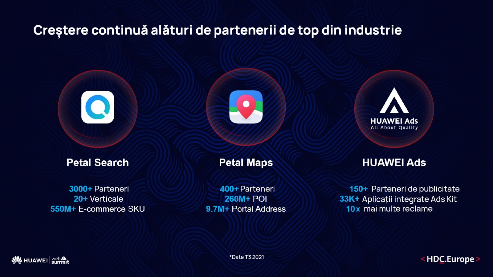 Mai aflăm că HUAWEI a înregistrat creșteri și în propria suită de aplicații HMS de bază cu HMS, HUAWEI Petal Maps care are acum 7 milioane de utilizatori lunar activi în Europa și HUAWEI Petal Search cu 32 milioane de uttilizatori activi la nivel mondial și peste 3000 de parteneri activi. Cota de venit a partenerilor a crescut cu 62% în 2021, față de anul trecut.