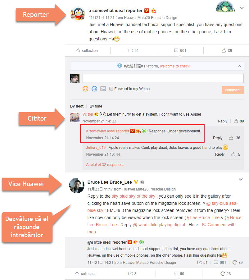 Am aflat despre el prin intermediul unei sesiuni AMA (ask me anything) de pe Weibo, în care reporterul din imaginea de mai sus făcea referire la faptul că va transmite întrebările celor care îl urmăresc, unui tehnician Huawei. Între timp vice președintele zonei Mobile Products de la Huawei a dat retweet afirmației reporterului, deci devine logic că el este acel “tehnician”.
