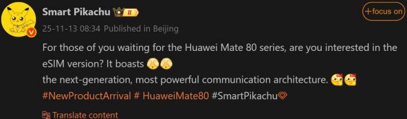 Seria Huawei Mate 80 urmează să debuteze în curând, iar zvonurile încep să se întețească. Conform tipsterului SmartPikachu (weibo), Huawei ia în calcul lansarea unui model eSIM-only pentru anumite piețe. Nu știm exact care sunt regiunile vizate, dar dacă zvonul se confirmă, ar fi primul model Huawei de acest tip, fără suport pentru SIM fizic.