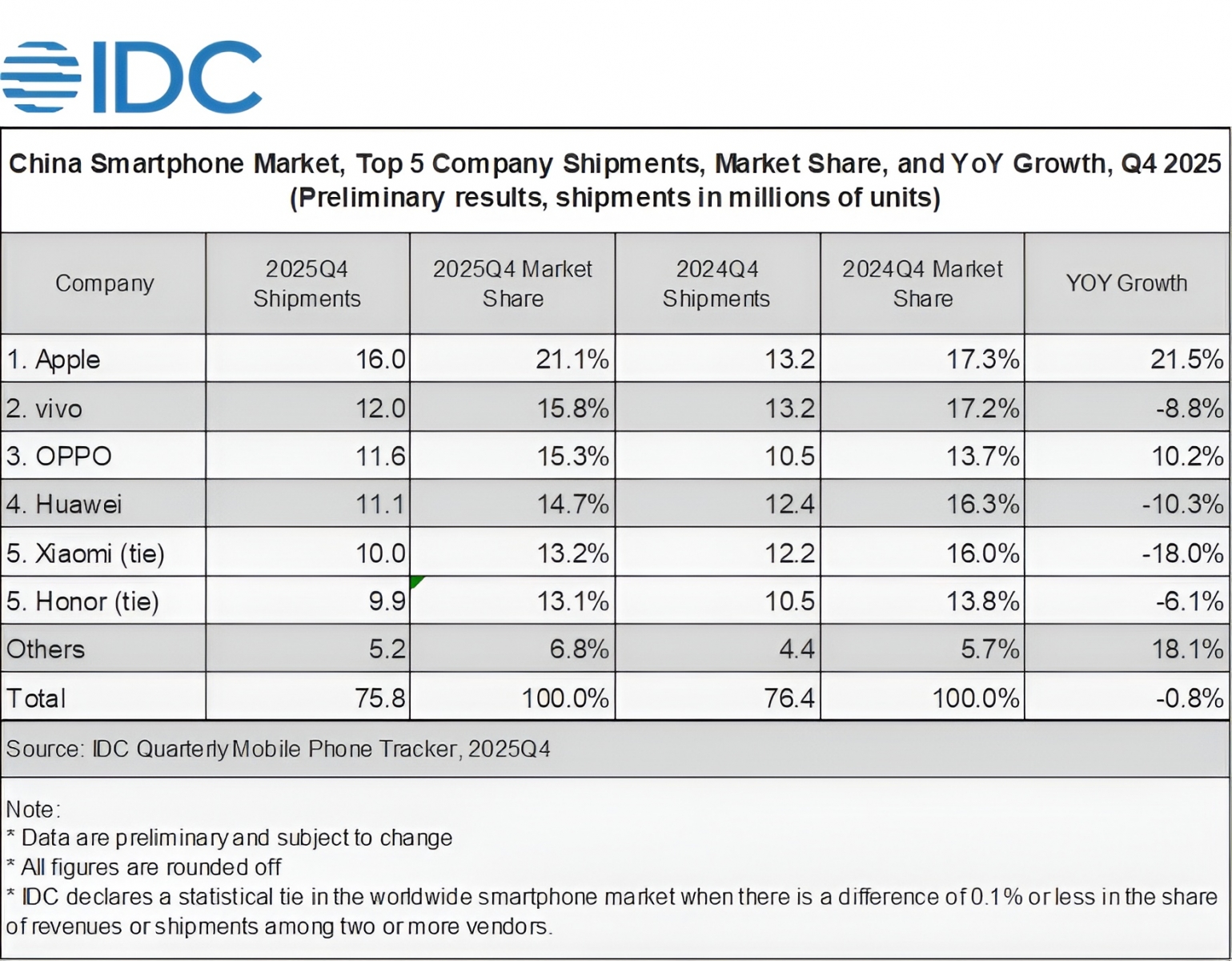 Apple, deși în scădere pe întreg anul, a avut un final de 2025 excelent, clasându-se pe primul loc în trimestrul patru cu o cotă de 21%, datorită iPhone 17. În spatele celor doi giganți s-au clasat Vivo, Xiaomi și Oppo, iar Honor a ieșit din top 5.
