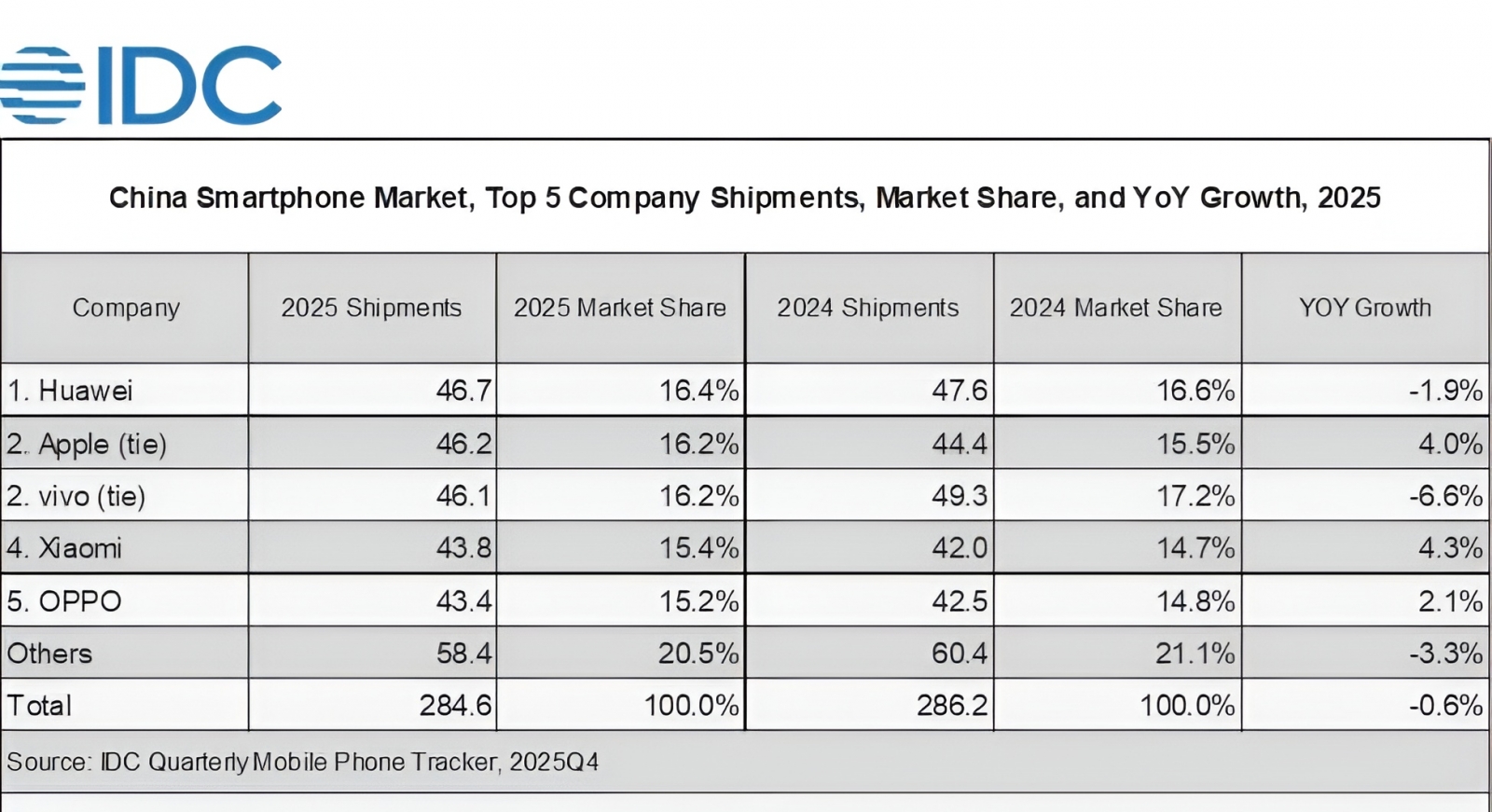 Huawei a reușit să revină în fruntea pieței de smartphone-uri din China în 2025, pentru prima oară din 2020 încoace, într-un context extrem de competitiv. Conform datelor furnizate de IDC, gigantul chinez a înregistrat o cotă de piață de 16,4%, livrând 46,7 milioane de unități, la o diferență infimă de Apple, care a atins 16,2%. Detalii avem mai jos!