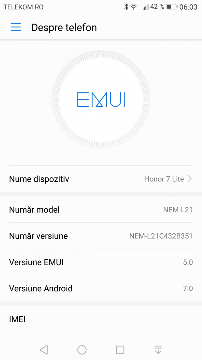 Este vorba despre Huawei Honor 7 Lite (a.k.a Honor 5c), telefon care tocmai ce a primit update-ul în România - detaliu despre care ne informează cititorul nostru Inocan Andrei căruia îi mulțumim pe această cale. Ni se dezvăluie că pachetul software cu seria NEM-L21C432B351 are 2,01 GB și că printre noutăți avem și interfața EMUI 5.0 inspirată de nuanțe de albastru și alb.