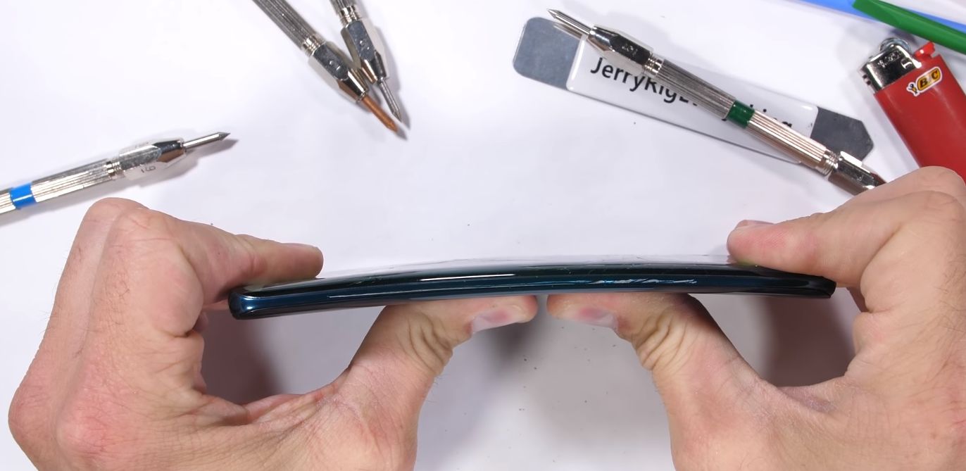 Spatele din sticlă curbată face un sunet ciudat când e zgâriat cu cutterul, amintind de un scratch de DJ pe un disc. La testul de ardere cu bricheta, panoul AMOLED rezistă 25 de secunde la flamă, dar pixelii nu îşi mai revin după ardere. Marele bend test a fost cam dezamâgitor, pentru că Huawei Mate 20 Pro a avut ecranul crăpat la prima îndoire. La a doua îndoire începe să se slăbească toată structura.