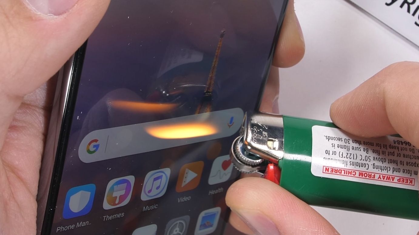 A încercat să zgârie şi scannerul de amprente şi "bretonul", dar nici una dintre componente nu a avut de suferit, nici măcar râcâite cu cutterul. Şi spatele şi rama metalică rezista bine. Cât despre testul cu bricheta, ecranul AMOLED rezista la 20 de secunde la flamă şi nu îşi mai revine, păstrând o pată albă pe ecran. Şi acum vine punctul slab: telefonul se îndoaie ceva mai mult decât ne aşteptam și decat credea și JerryRig.