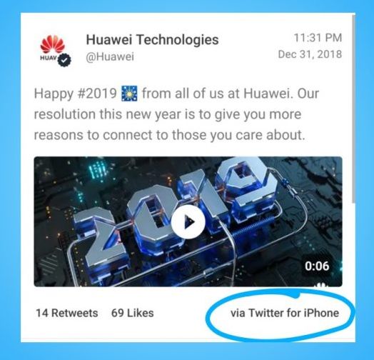 În noaptea dintre ani, pe la ora 23:31, contul oficial de Twitter Huawei Technologies a postat un mesaj de "La Mulţi Ani", exprimând şi clasica rezoluţie de an nou. Problema e că jos în colţul postării trona menţiunea "Posted from iPhone". Aşa ceva nu pică bine, mai ales acum când multe companii din China dau bonusuri dacă îţi cumperi telefoane chinezeşti şi te penalizează dacă ai iPhone.