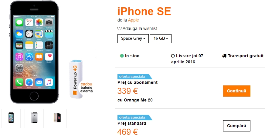 După consultarea ofertei din partea retailerilor și a operatorilor mobili, am ajuns la concluzia că cel mai ieftin iPhone SE de 16 GB din România, este vândut în acest moment de către Orange România la un preț de 469 euro ~ 2.097 lei. Terminalul este disponibil pe gri, auriu sau roz, și la achiziția sa fără abonament puteți cere decodarea gratuită. Iată și celelalte prețuri în ordine crescătoare: