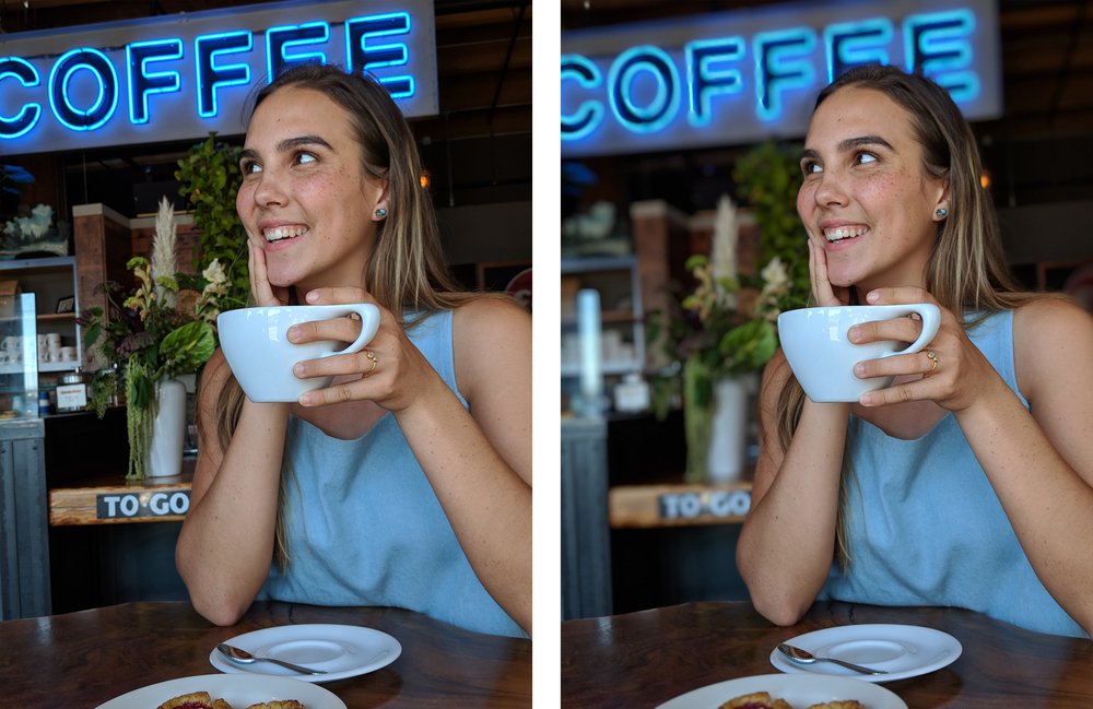 Deschiderea diafragmei este mai largă, deci camera captează mai multă lumină. Şi pentru a lămuri care e procedeul din spatele capturii Portrait, e vorba despre 3 sub procese: HDR+, o mască de segmentare şi o hartă de adâncime. HDR+ realizează până la 10 fotografii, mult mai multe decât am văzut la alte telefoane. Fotografiile sunt sub expuse pentru a evita arderea lor, iar apoi toate imaginile sunt combinate şi aliniate într-o singură fotografie.