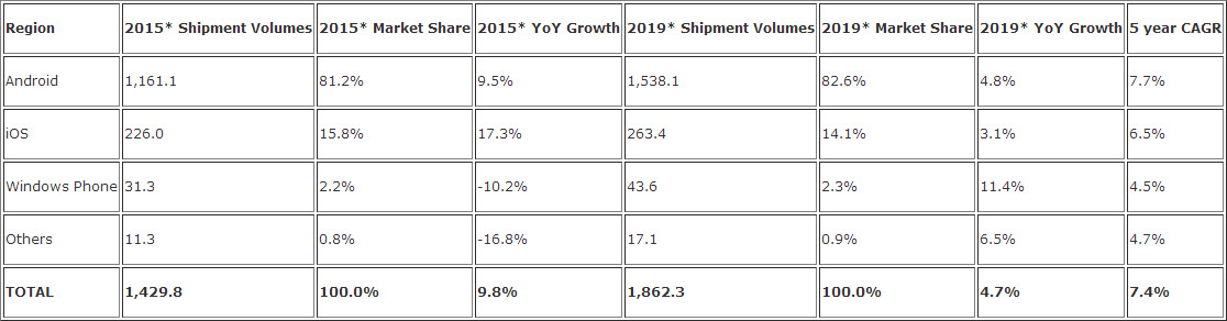Android ar trebui să îşi păstreze distanţa în faţa lui iOS până în 2019, ajungând de la 1.1 miliarde de unităţi livrate în acest an la 1.5 miliarde peste 4 ani. iPhone-urile vor face un salt de la 226 de milioane la 263 de milioane în 2019, dar un lucru trebuie reţinut aici: şi IDC se mai înşeală uneori, acestea fiind totuşi doar predicţii.