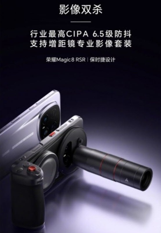 În fine, după OPPO Find X9 Pro şi Xiaomi 17 Ultra, acum vine şi rândul lui HONOR Magic8 RSR Porsche Design. HONOR a anunţat acel ataşament pe Weibo, alături de un teaser, care prezintă telefonul în ediţie Porsche. Vedem şi un obiectiv tele lung şi îngust, parte a unui camera kit, care include şi grip montat pe husa. Probabil aduce şi baterie externă, butoane în plus şi acel inel rotativ pentru focus, reglaje de zoom sau expunere.