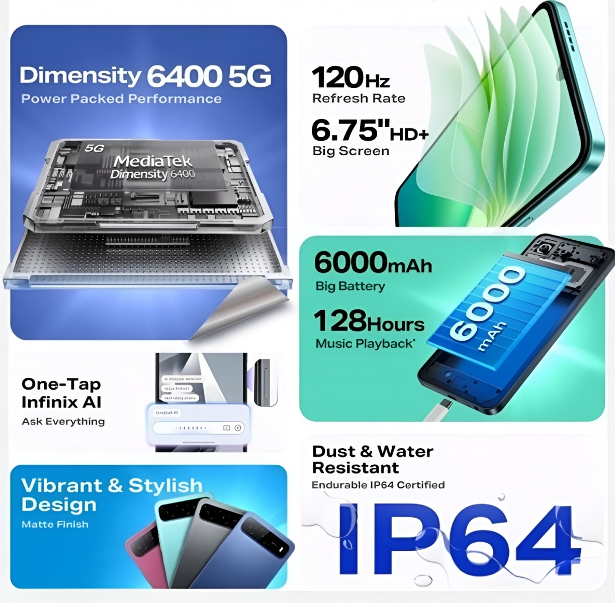 Terminalul va primi un display IPS LCD de 6.75 inch în diagonală, cu rezoluție HD+ și refresh rate de 120Hz. Va rula Android 15 din fabrică, alături de interfața XOS 15. Asta înseamnă că va include și câteva funcții AI, cel mai probabil axate pe fotografie. Infinix Hot 60i aduce certificare IP64 pentru rezistență la apă și praf și primește o baterie de 6000 mAh.