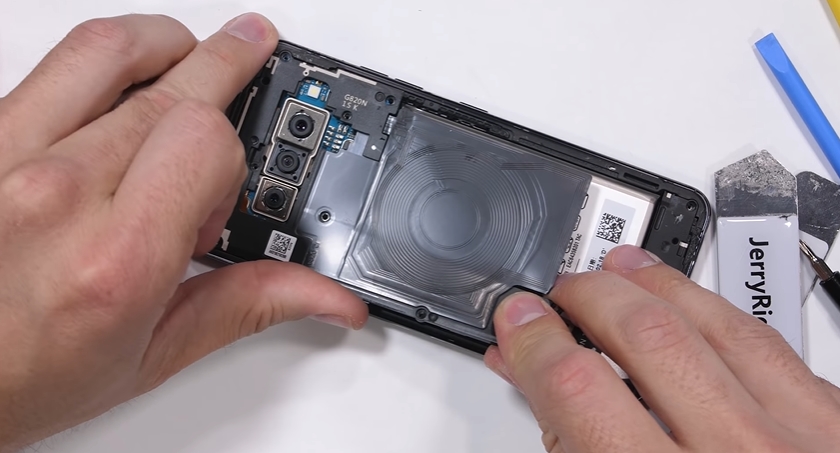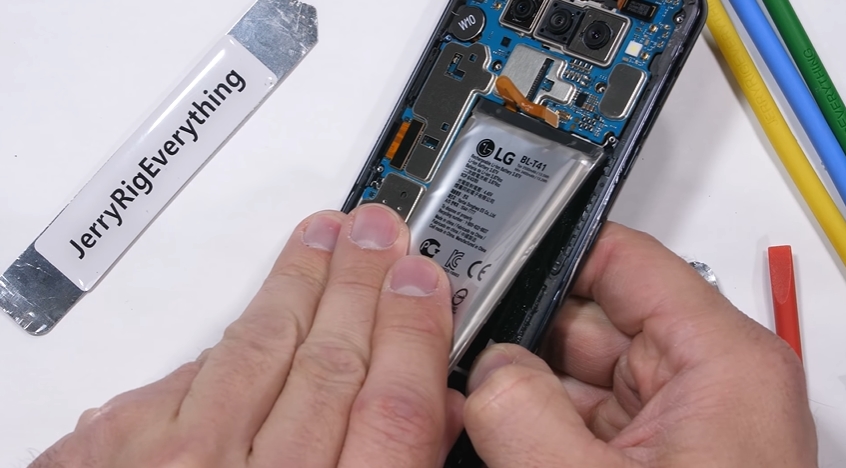 Fix asta se întâmpla și pe LG G7 ThinQ și în loc de un adeziv clasic, sud-coreenii folosesc un lipici permanent care face un chin din procesul de înlocuire al bateriei. Vedem în clip cum Zack se chinuie să scoată bateria, acesta avertizând că se poate ajunge chiar și la explozii în cazul în care bateria este înțepată din greșeală cu unelte folosite.