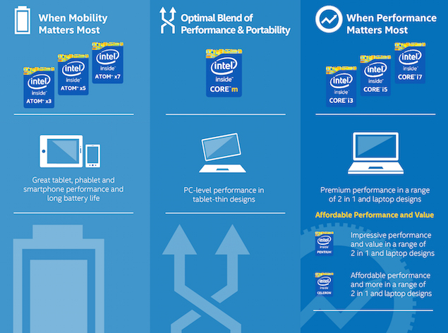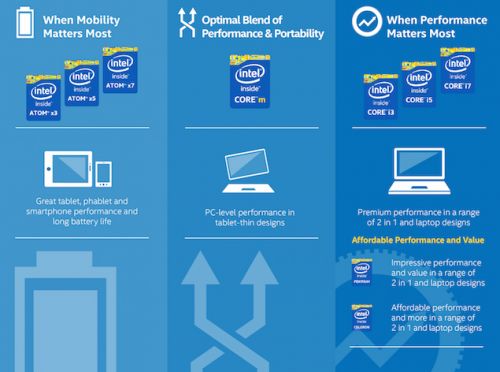 Intel afirma că un procesor Atom X3-C3230RK, un model quad core la 1.2 GHz va depăşi performanţele unui Qualcomm MSM8212 sau MediaTek MT6582 cu 50% în sarcini media uşoare. Atom x3 este un chip 64 bit, care ar putea fi inclus şi pe smartphone-uri low cost şi tablete. Intel a anunţat recent şi gamele Atom x5 şi x7, bazate pe arhitectura Cherry Trail de 14 nm.