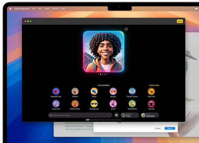Începem cu Image Playground, o secțiune ce ne permite crearea de imagini personalizate folosind diferite teme, costume, accesorii și alte elemente. Prin adăugarea de descrieri text sau fotografii, putem genera imagini în stiluri diferite, precum Animație sau Ilustrație. Funcția primește integrare cu Messages, Freeform, Keynote, dar este disponibilă și ca aplicație de sine stătătoare.
