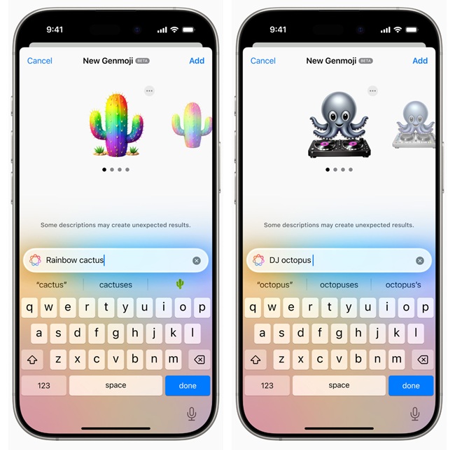 Avem și noutăți pentru Genmoji care trece la nivelul următor. Poți să scrii acum o descriere și să generezi emoji-uri custom, inclusiv unele bazate pe fotografii din galeria ta. Le poți customiza după bunul plac, ba chiar să le adaugi și accesorii precum pălării sau ochelarii de soare și mai apoi le trimiți în mesaje sau ca stickere.