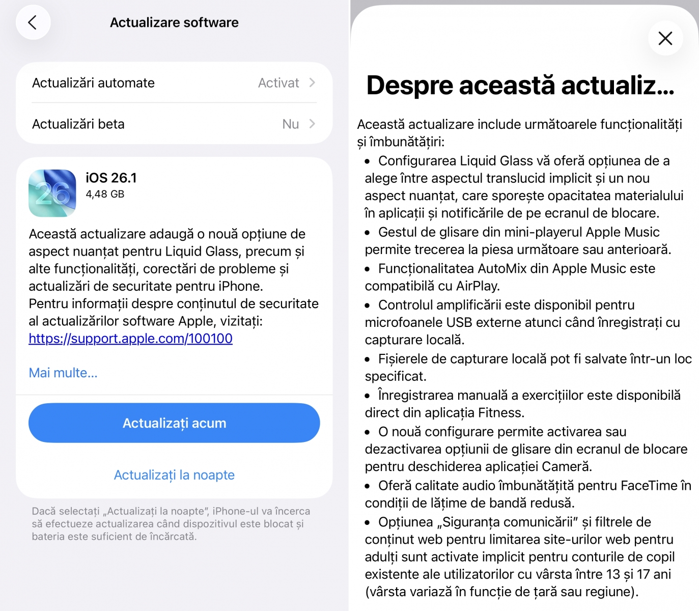 De astăzi se distribuie oficial și iOS 26.1, un release care rezolvă o problemă mare întâmpinată de către utilizatorii, aceea a lizibilității reduse a textului și elementelor transparente de deasupra în unele circumstanțe. Apple rezolvă asta printr-o opțiune de aspect nuanțat care sporește opacitatea în aplicații. Și notificările de pe lockscreen se văd mai bine.