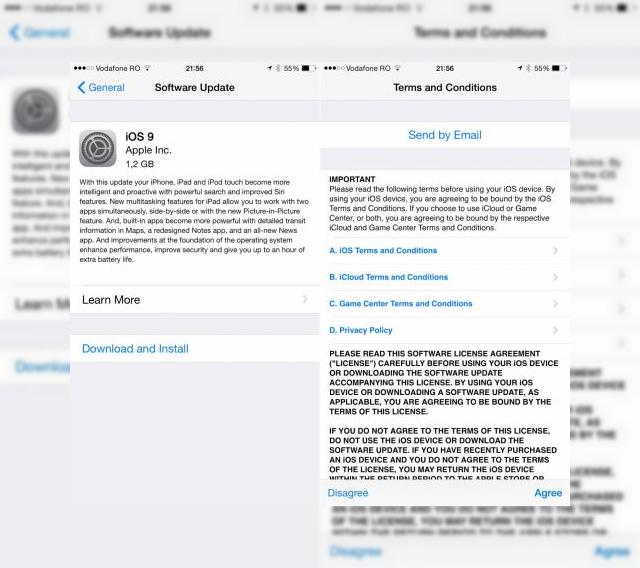 Pentru că azi e 16 septembrie, a venit şi marele moment al actualizării la iOS 9. Apple oferă actualizarea chiar în aceste clipe şi am primit confirmarea pe terminalele noastre după cum puteţi vedea mai jos. Aflaţi că pachetul software ocupa între 1.2 şi 1.8 GB în funcţie de terminal, faţă de anul trecut, când iOS 8 ocupa între 4.5 şi 5 GB.