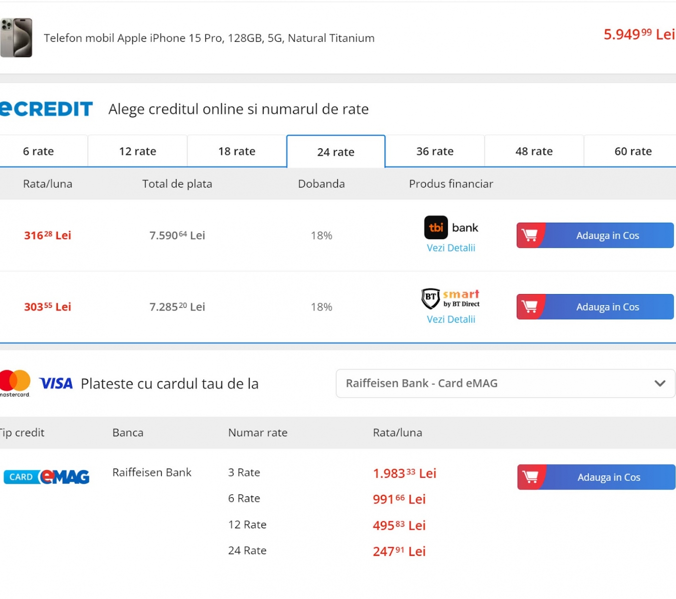 Mai sunt şi opţiuni de rate cu cardul de la BT, Credit Europe, Garanti Bank, Alpha Bank, BRD. Un iPhone 15 Pro poate fi plătit în 24 de rate cu card eMAG Raiffeisen, cu 247 lei pe lună. Sau 303 lei pe lună prin BT Direct.