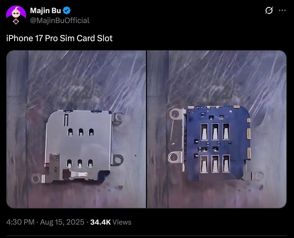 Un cunoscut leaker de pe platforma X (@MajinBuOfficial) a publicat imagini în care ar apărea carcasa unui iPhone 17 Pro cu slot fizic pentru SIM. Dacă acestea sunt reale, înseamnă că Apple va păstra în continuare această opțiune în unele regiuni, probabil în cele unde adopția eSIM-ului e încă redusă. Informația vine în contradicție cu zvonurile anterioare, care sugerau eliminarea completă a slotului pentru modelele Pro și Pro Max.