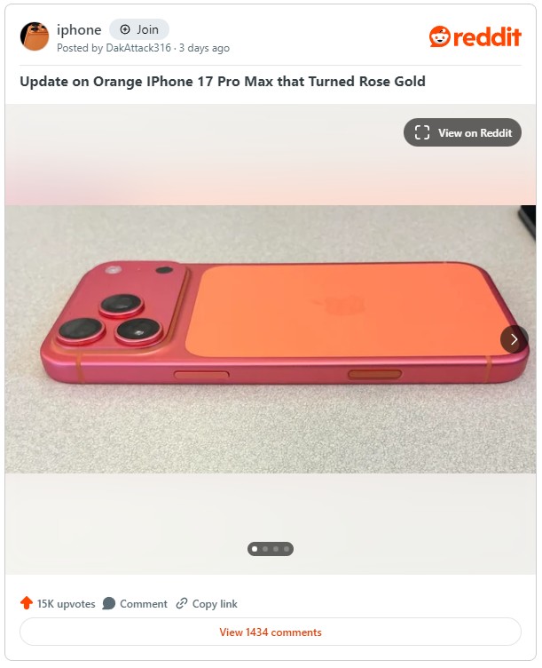 După un val de critici la adresa Apple cu privire la culorile și materialele folosite pentru noile modele iPhone 17 Pro și 17 Pro Max, iată că apare o nouă „problemă”. Un utilizator Reddit susține că noul său iPhone 17 Pro Max, cumpărat în varianta Cosmic Orange, a început să se decoloreze treptat, ajungând la o nuanță…roz. Pare că aluminiul folosit în cazul carcasei și-a schimbat culoarea în timp. Mai jos avem detalii!