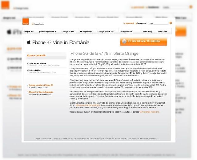 Popularul handset iPhone 3G soseste prin Orange Romania maine noapte, incepand cu ora 00.00, dar in avampremiera lansarii am facut o super-descoperire: pagina secreta a site-ului oficial, care dezvaluie pretul de pornire al handsetului iPhone 3G si anume 179 de euro.