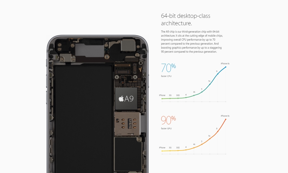 La interior avem parte și de noul procesor Apple A9 pe 64-bit, un chip ce este construit pe o nouă arhitectură, fiind optimizat pentru utilizarea de zi cu zi, dar și adoptând un GPU puternic la pachet. Primim și un senzor Touch ID de nouă generație, acesta fiind de două ori mai rapid la ora actuală.