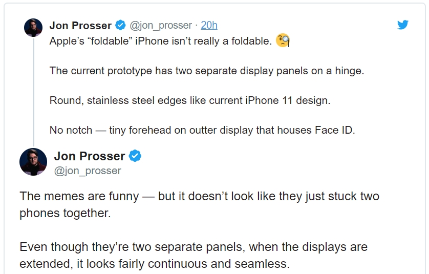 Inevitabil internetul a reacționat prin meme-uri (ex: două iPhone-uri 11 lipite în formă de pliabil) la aceste dezvăluiri făcute de către Jon Prosser, astfel că zvonacul a fost nevoit să vină cu un update. Acesta a spus că prototipul de iPhone pliabil nu arată ca și cum două iPhone-uri ar fi puse unul lângă altul. Deși dispune de două display-uri separate, atunci când este deschis telefonul dă impresia de continuitate.