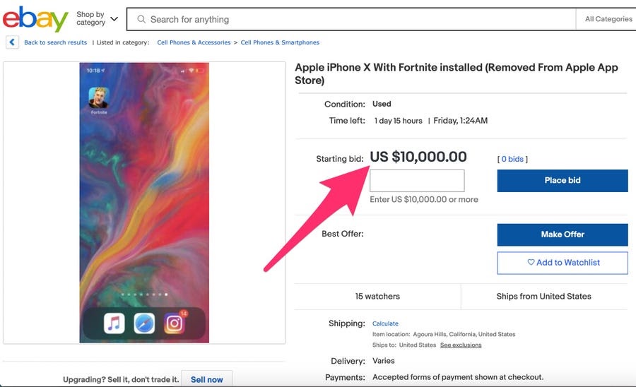 Între timp dacă te uiţi pe eBay au început să apară tot mai mulţi reselleri cu iPhone-uri cu Fortnite preinstalat. Peste 100 de listări erau disponibile doar la finalul săptămânii trecute. Ce e ironic e că jocul e gratuit şi poţi face rost de el imediat pe PS4, Xbox One, PC, Mac şi Nintendo Switch. Nici pe Android nu e aşa greu (găsiţi installere pe web + Galaxy Store-ul Samsung), doar pe iOS se complică treaba (acolo trebuie jailbreak bănuiesc şi să găseşti pachetul de instalare dintr-o alternativă pirat la App Store).
