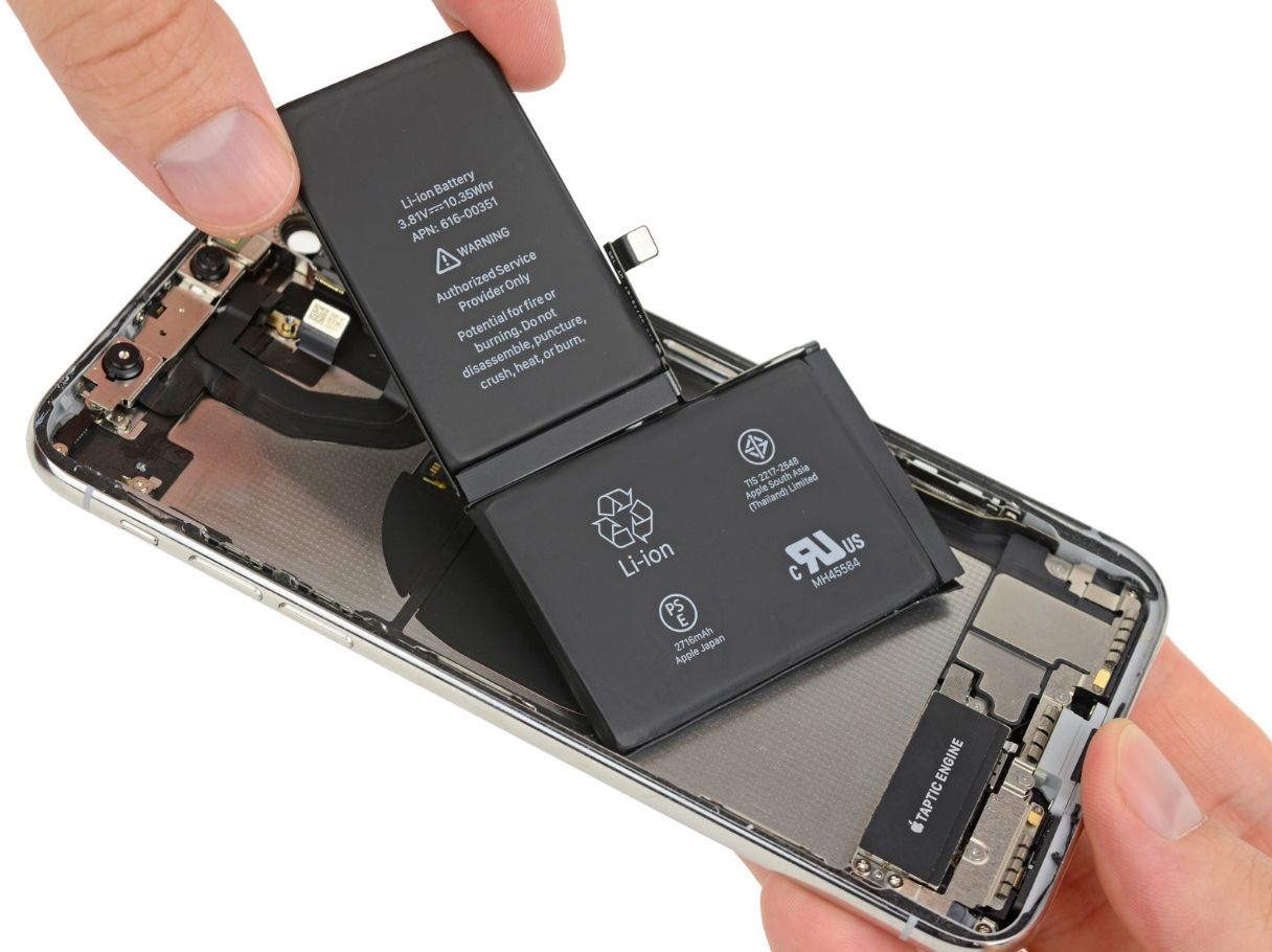 Terminalul nu este diferit de orice alt iPhone doar pe dinafară, ci şi la interior, se pare. Foloseşte o baterie în formă de litera "L", cu două celule şi o placă de bază cu un nivel de miniaturizare nemaivăzut până acum. Placa de bază a lui iPhone X este cam de mărimea a două treimi din placă de bază a lui iPhone 8 Plus şi asta deşi vine cu extra conectori şi chip-uri incluse.