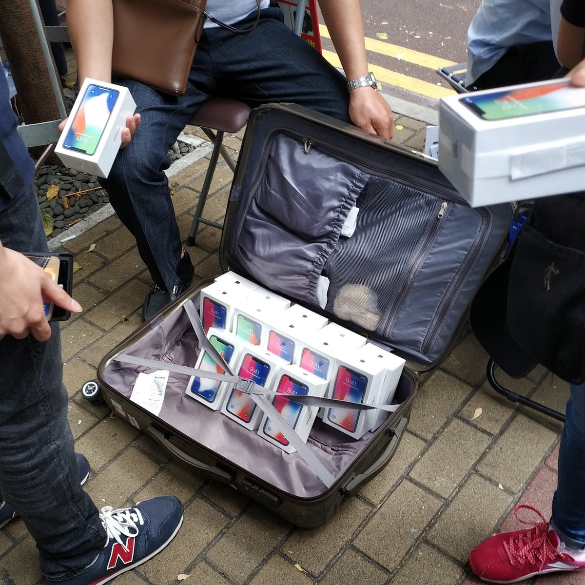 Descoperim prin intermediul unui tweet din partea editorului Richard Lai de la Engadget, faptul că acești bișnițari vând terminale iPhone X chiar la doi pași de un Apple Store din Hong Kong. Sunt și fotografii atașate în care vedem valize pline de telefoane gata să își găsească posesori.