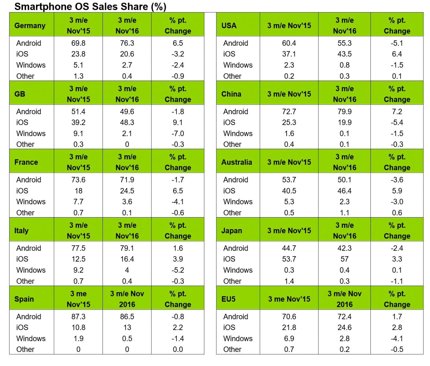 Se pare că iOS şi Android au câştigat cotă de piaţă în zona celor 5 mari naţiuni din Europa, pe fondul picajului lui Windows. iOS a stat cel mai bine în Marea Britanie, cu o creştere de 9.1% toamna trecută, faţă de perioada echivalentă din 2015. Windows/Windows Phone continuă să pice, având în Marea Britanie spre exemplu o cotă de 2.1% în noiembrie 2016, faţă de 9.1% în noiembrie 2015.