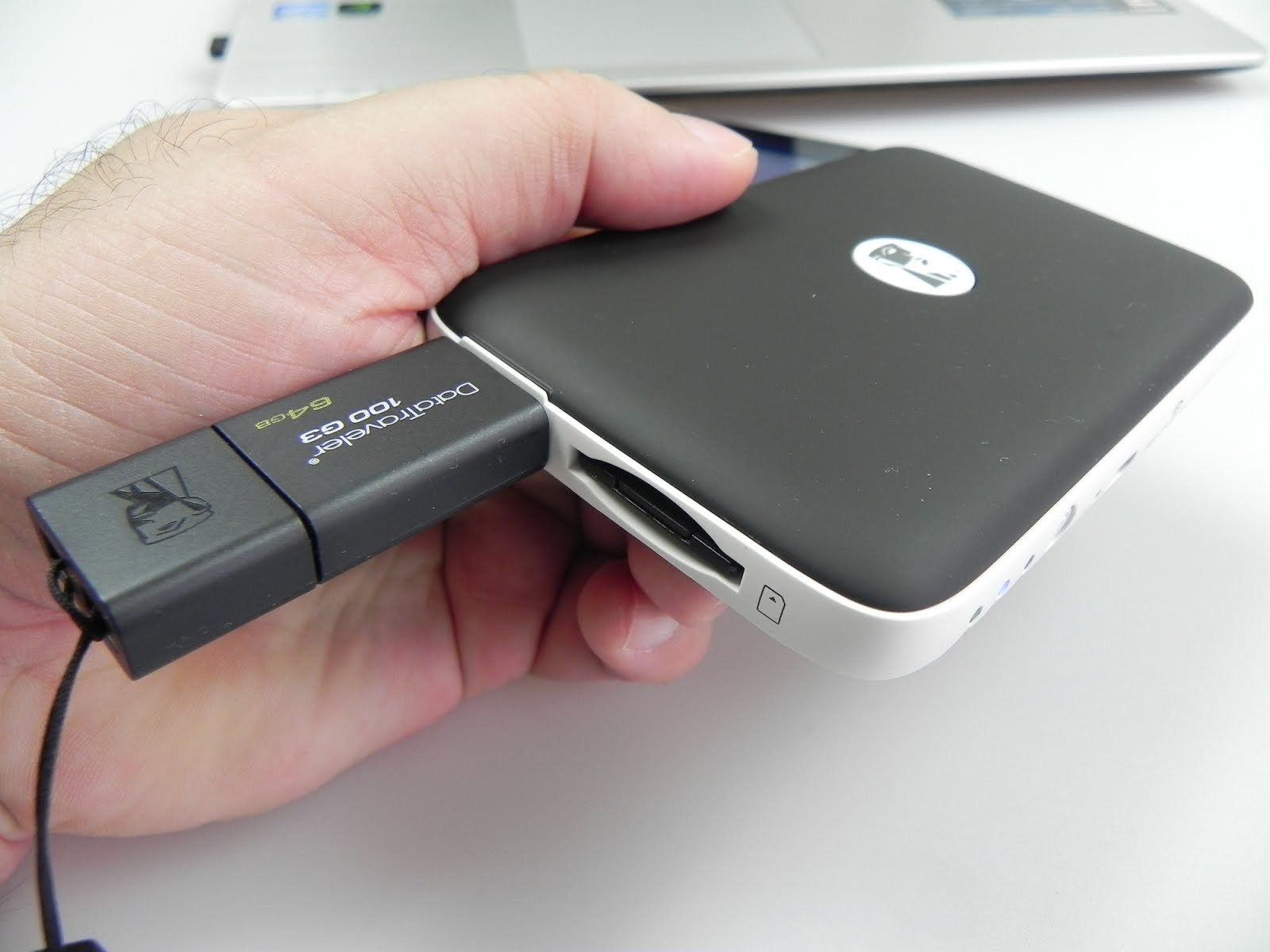 Aflăm că acest dispozitiv cântărește 171 grame, măsoară 19.28 mm în grosime și faptul că aduce în pachet un cablu USB și un adaptor pentru cardurile microSD. Kingston MobileLite Wireless G2 poate fi încărcat fie printr-un port microUSB de la laptop, fie prin încărcătorul unui telefon. Din punct de vedere al porturilor, remarcăm prezența unui port microUSB 2.0, a unui port Full USB 2.0, un slot pentru adaptor microSD și un port ethernet.
