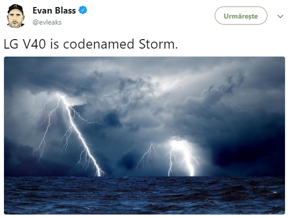 Celebrul leaker indică faptul că telefonul este cunoscut sub numele de cod Storm și că acesta va fi lansat comercial drept LG V40, fără particula "ThinQ" adoptată de LG pentru noul flagship G7 ce vine pe 2 mai. Nu se știu prea multe despre phablet-ul de față, dar ne putem aștepta la dotări de top precum procesor Snapdragon 845, 6 sau 8 GB de RAM și o cameră duală în partea din spate.