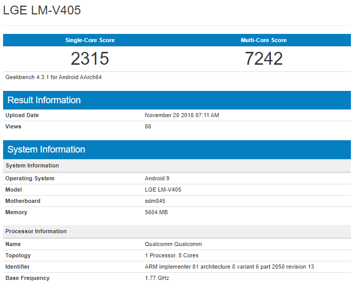 Este vorba despre versiunea LM-V405, cea asociată operatorului american Verizon care aduce 6 GB de RAM și procesor octa-core Qualcomm Snapdragon 845. Ca performanțe remarcăm un scor single-core de 2315 puncte, respectiv un scor de 7242 puncte la testul multi-core.