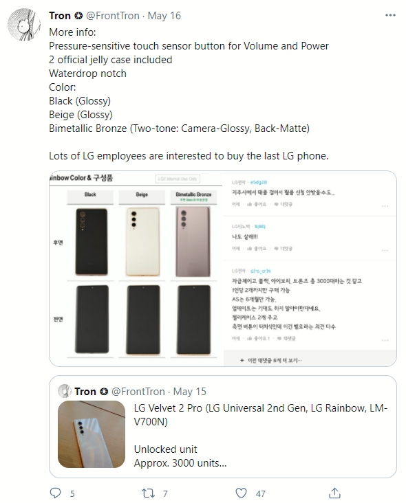 Fiecare angajat are voie să cumpere maxim două unități pe persoană, o unitate având prețul de aproximativ 170 de dolari. LG Velvet 2 Pro este disponibil în nuanțe precum negru, bronz și Ivory (alb). De asemenea, aflăm că acestea nu vor primi actualizări și vor avea parte de aproximativ 6 luni de garanție, atât cât piesele sunt disponibile. Zvonacul ne oferă și câteva detalii despre acest telefon, însă nu i se cunosc încă specificațiile.