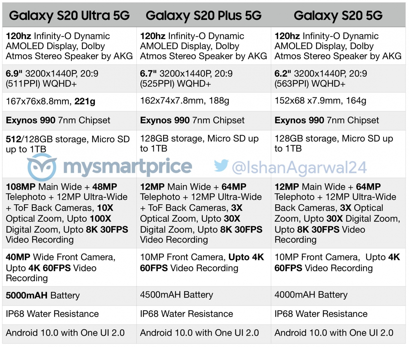 De curând am văzut și o comparație între machetele celor 3 variante, funcții ale camerei foto detaliate, dar și dezvăluiri despre culorile în care vor sosi, deduse pe seama wallpaper-urilor oficiale incluse în software. Astăzi publicația mysmartprice.com alături de tânărul leaker @IshanAgarwal24 ne prezintă ceea ce susțin că sunt listele finale de specificații pentru flagship-urile Samsung în variantele 5G.