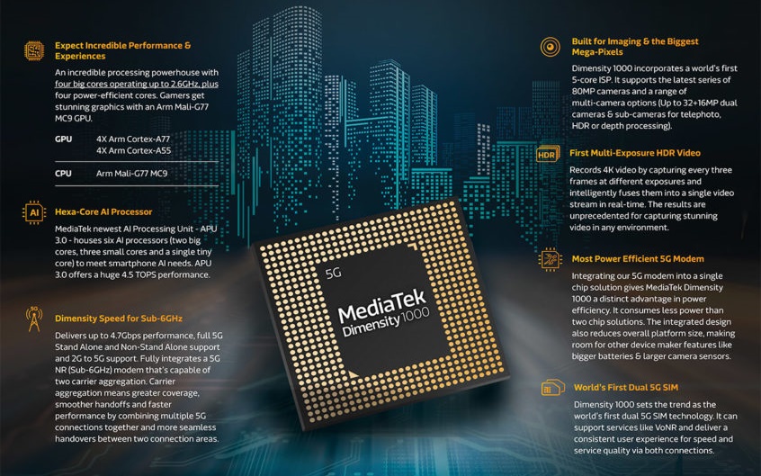 Bifăm și compatibilitate pentru rețele 2G, 3G și 4G, suportul Wi-Fi 6, respectiv cel Bluetooth 5.1. Din declarațiile MediaTek, se poate ajunge aici la viteze de până la 4.7 Gbps downlink, respectiv 2.5Gbps uplink. Dimensity 1000 5G este un procesor octa-core ce include 4 nuclee ARM Cortex-A77 de 2.6 GHz pentru performanță, respectiv 4x nuclee ARM Cortex-A55 de 2.0 GHz pentru eficiență energetică.