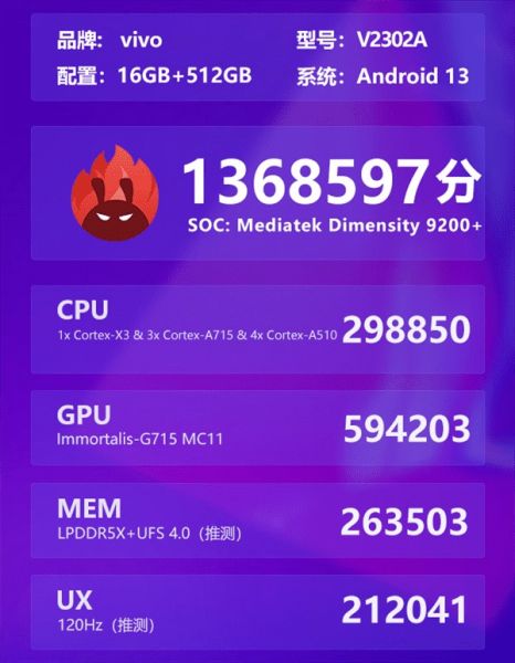 Cipsetul pare să se afle la bordul unui telefon vivo. Se vehiculează că iQOO Neo8 Pro e smartphone-ul cu acest CPU sub capotă. El are 16 GB de memorie RAM LPDDR5X, 512 GB de stocare rapidă (UFS 4.0) și rulează Android 13. Listarea dezvăluie un scor excelent, de 1.368.597 de puncte. Vorbim despre aproximativ 70.000 de puncte peste generația actuală și anume Dimensity 9200.