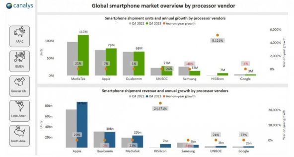 La începutul anului avem și date interesante sosite prin intermediul Canalys. Deși piața smartphone a cam stagnat în 2023, CPU-urile continuă să fie vândute în număr mare, producătorii asigurându-se practic că sunt suficient de multe unități produse pentru a îndeplini cererea la nivel global. Printre marii producători de cipseturi îi avem pe MediaTek, Qualcomm și Apple. Primul menționat a avut parte de o creștere spectaculoasă aparent. Mai jos am detalii.