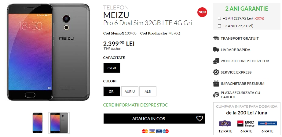 La mijlocul lunii aprilie, producătorul chinez Meizu anunța lansarea smartphone-ului Pro 6 - un terminal cu dotări din zona high-end ce beneficiază și de un design elegant. Produsul de față se poate regăsi de acum și în oferta QuickMobile.ro, fiind disponibil în treivariante diferite de culoare: alb, auriu și gri.