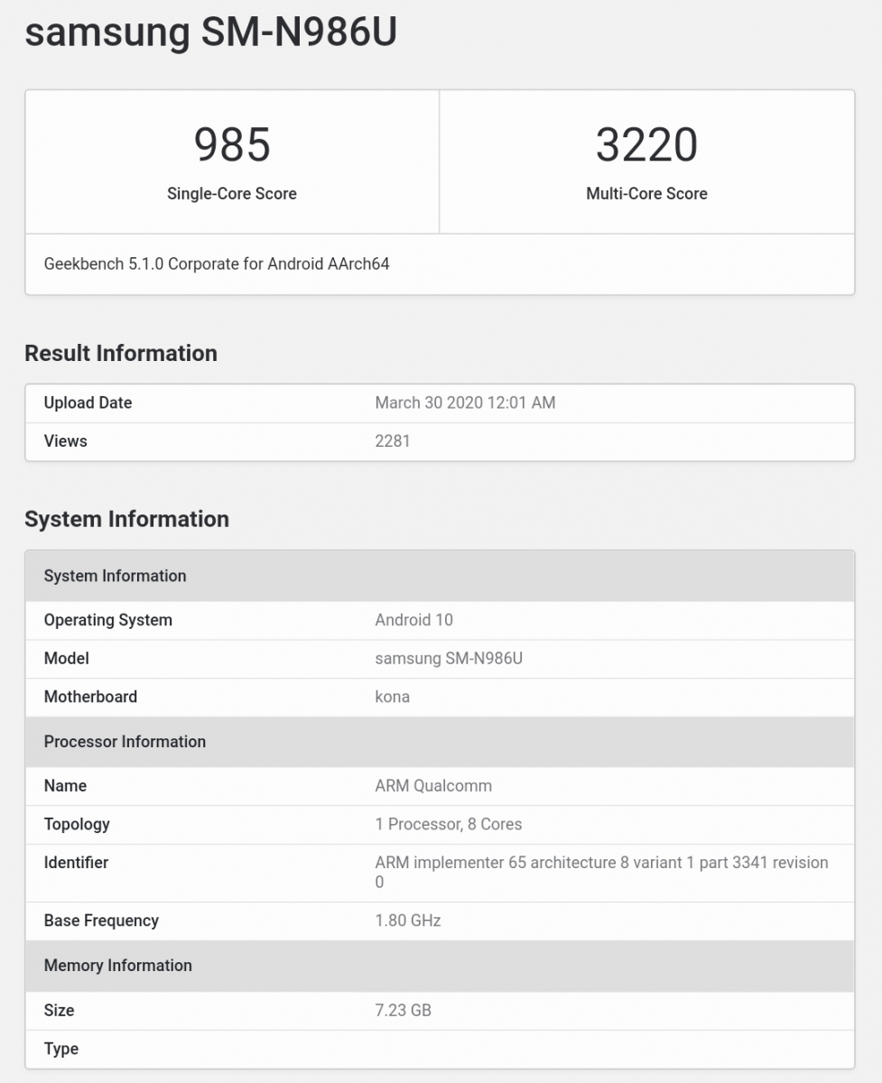 Conectivitatea 5G este evident în cărţi, alături de 12 sau 16 GB RAM pentru modelul Ultra şi până la 512 GB stocare. Note 20 cel standard ar avea un ecran plat Super AMOLED cu refresh rate de 60 Hz doar. Între timp seria Galaxy Note 20 a primit certificarea NFC şi scăpări în GeekBench, cu 8 GB RAM, Snapdragon 865 şi Android 10.