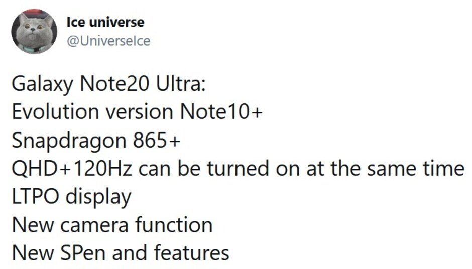 Ice Universe a scăpat şi un procesor Snapdragon 865+ pentru Galaxy Note 20 Ultra şi un ecran Quad HD+ la 120 Hz. O bună perioadă de timp am crezut că nu va exista un Snapdragon 865+, ci că avem doar Snapdragon 865 în acest an. Chiar Qualcomm negase acest lucru. Mai plauzibil era acel Exynos 992 scăpat pentru seria Note 20. Sursa mai scrie şi că avem ecran LTPO, noi funcţii ale camerei şi un nou S Pen, cu funcţii noi. Putem propune o teorie şi anume că seria S20 a rămas la refresh rate 120 Hz pe maxim Full HD+, pentru a îl lăsa pe Note 20 să aducă "inovaţia" refresh rate-ului de 120 Hz pe rezoluţie Quad HD+.