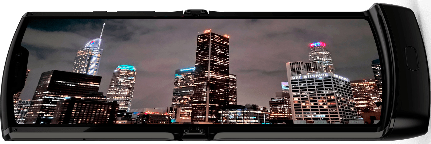 Avem în prim plan imaginea de mai sus ce ne prezintă telefonul complet deschis cu al său ecran pliabil îngust (probabil aspect 21:9) și o bărbie caracteristică seriei MOTO RAZR acolo unde se va afla un mic scanner de amprente pentru autentificare. Vedem și zona balamalei, punctul în care se pliază ecranul iar sus apare ceva nu tocmai plăcut din punct de vedere vizual - un breton generos care găzduiește senzorii și camera selfie.